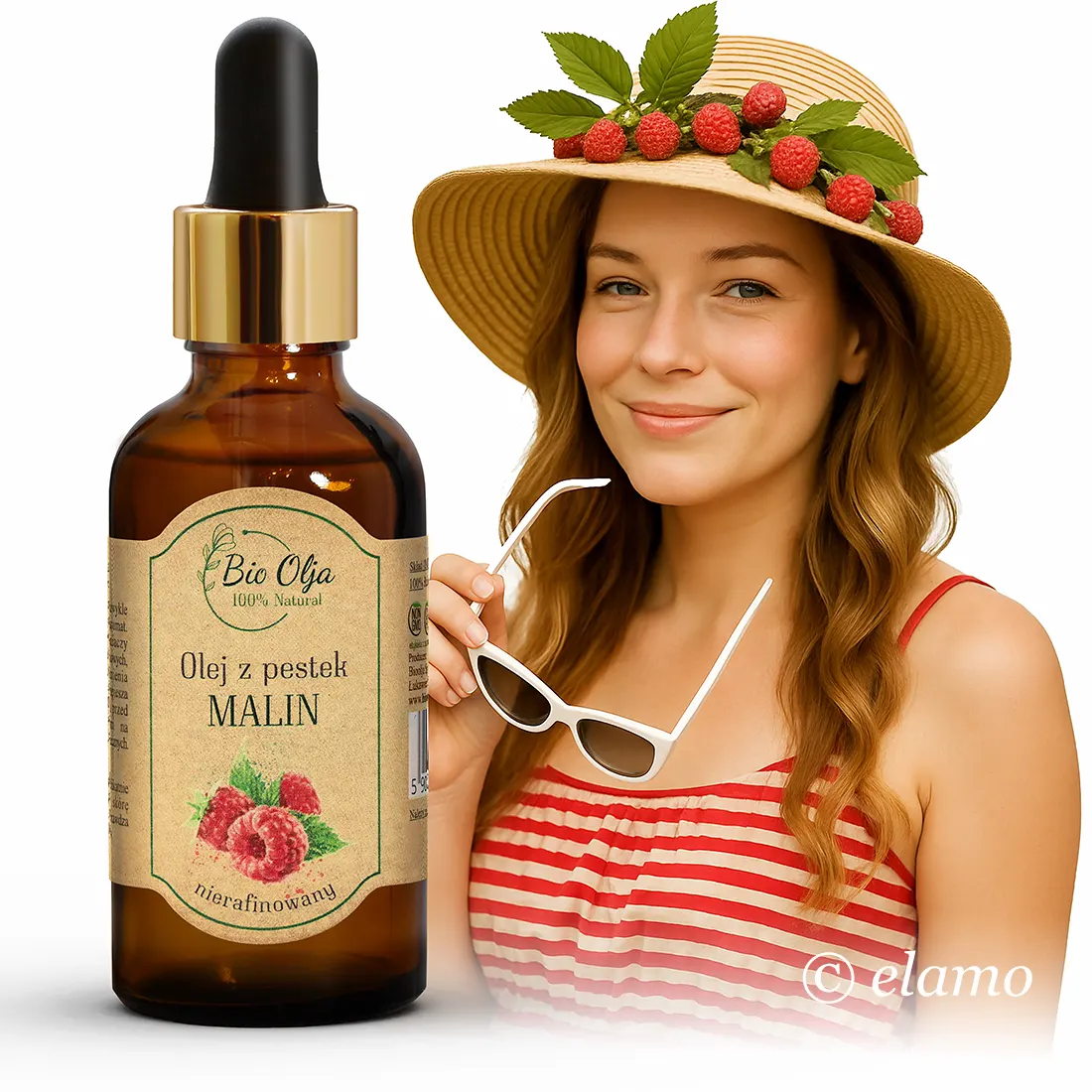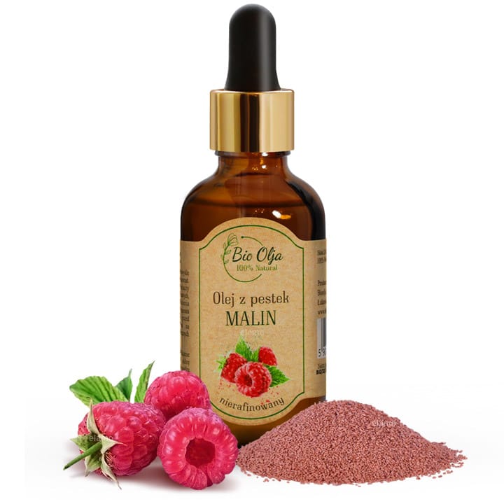 Zimnotłoczony, delikatny, lekki i odżywczy olej z pestek malin firmy BioOlja pozyskiwany jest z pestek, które są produktem ubocznym przemysłu soków owocowych. Dzięki temu owoce maliny wykorzystywane są w 100% a więc nie marnują się. Pestki są oczyszczane i suszone a następnie pozyskiwany jest z nich olej poprzez tłoczenie na zimno. Uzyskany w ten sposób olej firmy BioOlja zapewnia niezwykle świeży, lekki owocowy aromat. Jest pełen przeciwutleniaczy i niezbędnych kwasów tłuszczowych, dzięki czemu ma szerokie zastosowanie w pielęgnacji skóry.