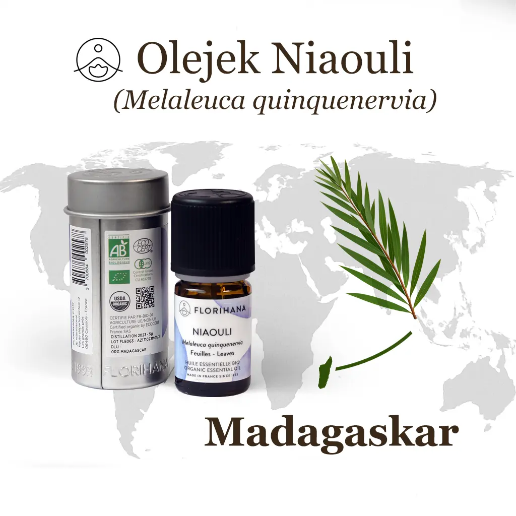 Niaouli (Melaleuca quinquenervia, syn. M. viridiflora) – nazywane również szerokolistnym drzewem herbacianym (ang. broad-leaved tea tree), jest wiecznie zielonym, drzewem i osiąga 3–10 m wysokości. Jego pień pokrywa charakterystyczna, miękka i gąbczasta kora, a duże, intensywnie pachnące liście są bogate w związki aktywne [9]. Jest blisko spokrewniony z popularnym drzewkiem herbacianym (Melaleuca alternifolia) oraz kajeputem (Melaleuca cajuputi), co sprawia, że wykazuje podobne właściwości antyseptyczne i wspomagające drogi oddechowe.