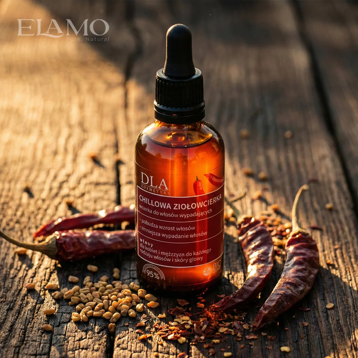 Odkryj moc, jaką kryje w sobie Chillowa Ziołowcierka. To bezalkoholowa kuracja olejowa, w której synergia kapsaicyny (chili) i kozieradki pobudza mikrokrążenie skóry głowy, dotleniając cebulki i hamując wypadanie włosów.