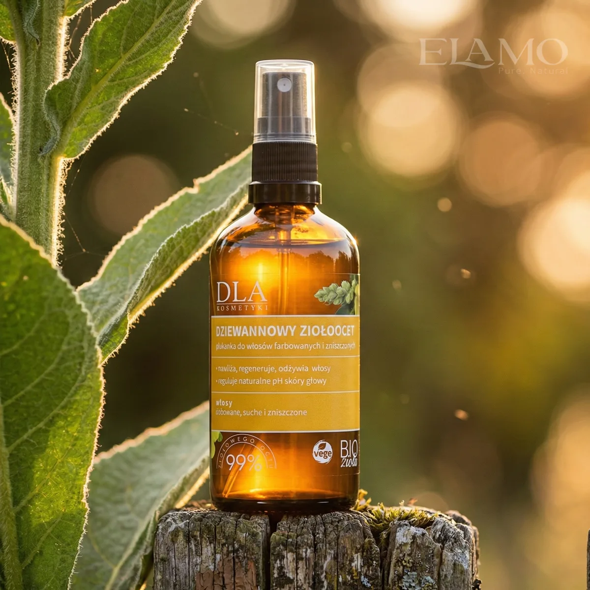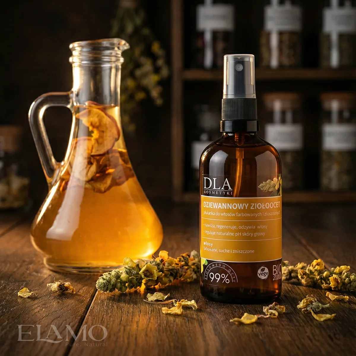 Jeśli Twoje włosy po farbowaniu, stylizacji na ciepło czy zimie są szorstkie, łamliwe i trudne do rozczesania, dziewannowy ziołoocet działa jak roślinny „top coat” –