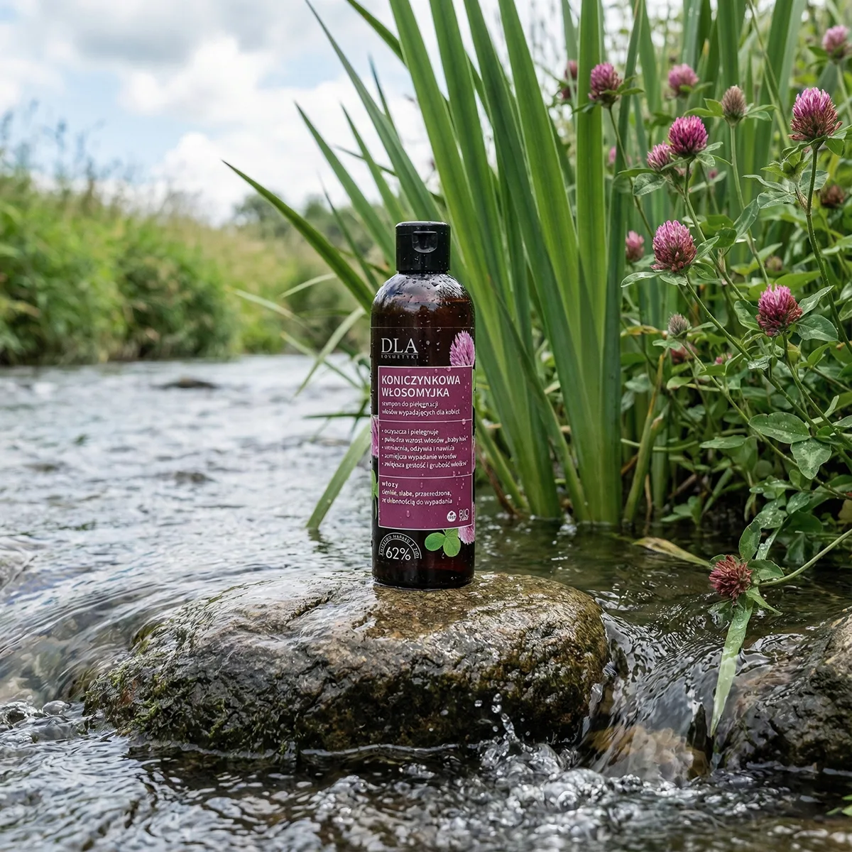 Szampon do włosów wypadających DLA Kosmetyki - Koniczynkowa Włosomyjka zawiera unikalną kompozycję składników, które działają wielotorowo na przyczyny wypadania włosów: