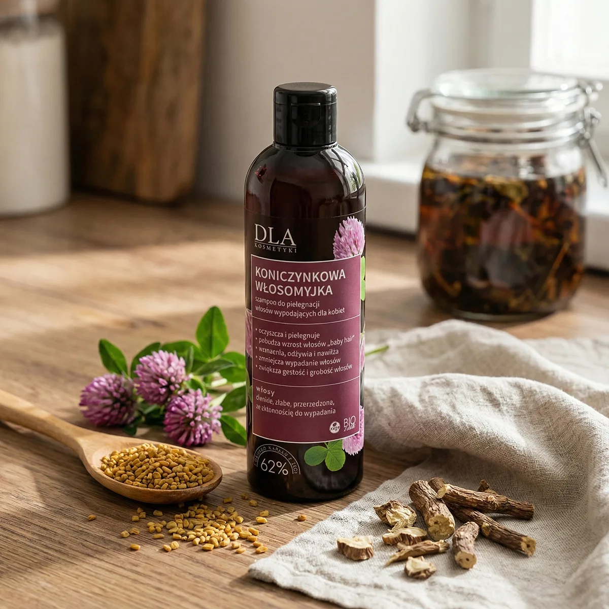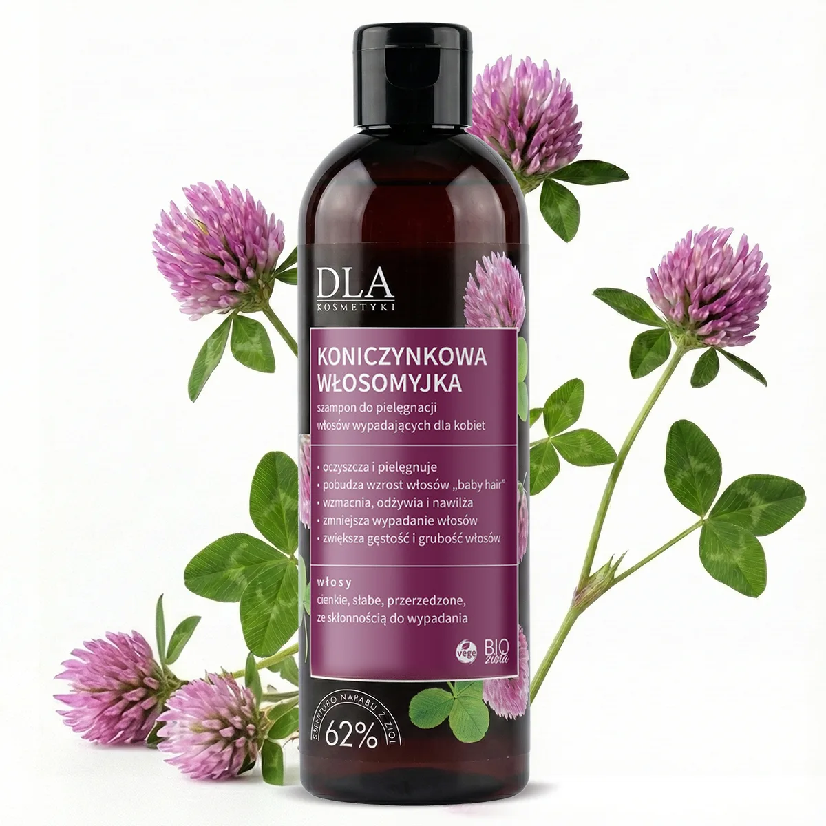 Formuła Koniczynkowej Włosomyjki opiera się m.in. na czerwonej koniczynie, znanej z zawartości fitoestrogenów wspierających osłabione, przerzedzone włosy. Szampon nie jest lekiem, ale może być wartościowym uzupełnieniem pielęgnacji przy wypadaniu włosów związanym z gospodarką hormonalną, obok diety i konsultacji ze specjalistą.