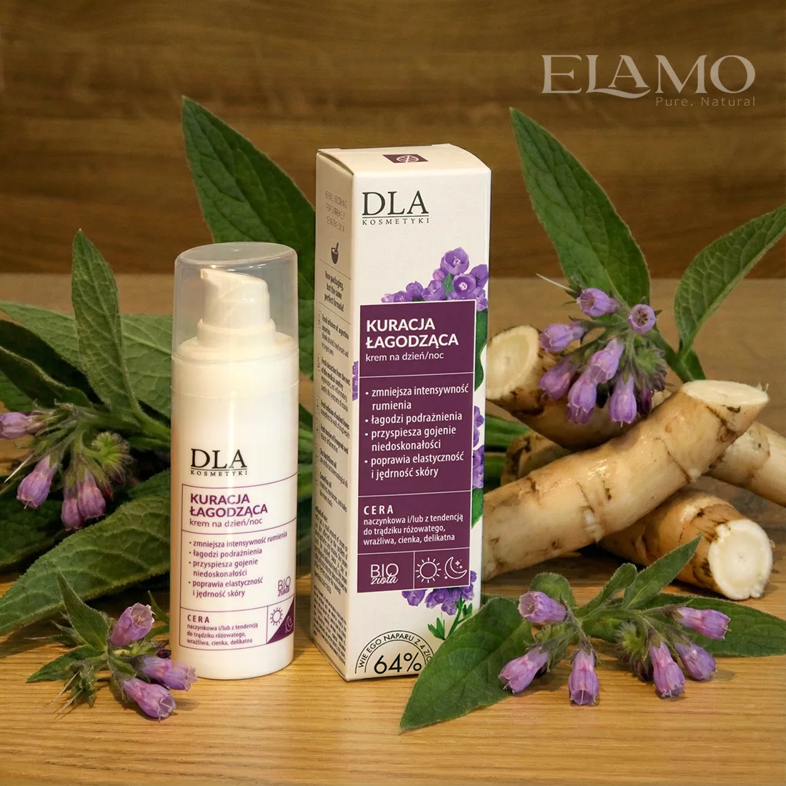 - Największy wyróżnik: Baza ze świeżych naparów (pięciornik, żywokost, orzech) zamiast wody – większe stężenie składników aktywnych.