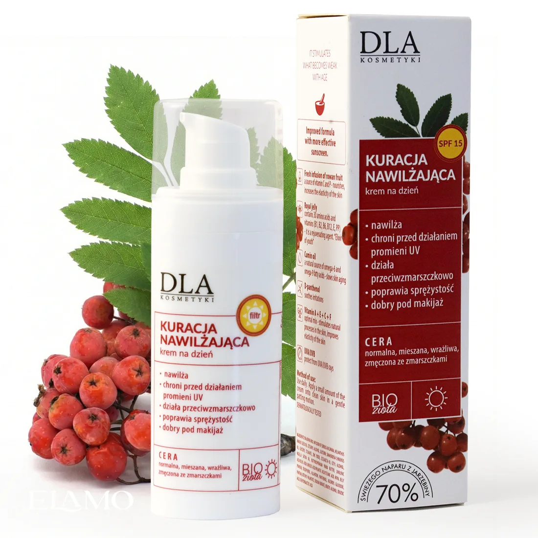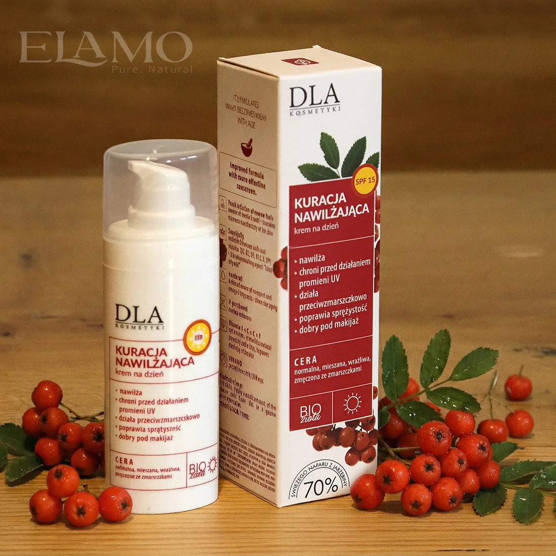 Kuracja Nawilżająca krem na dzień bazuje na świeżym 70% naparze z owoców jarzębiny (Sorbus aucuparia) oraz mineralnym SPF 15. Dla cery normalnej, mieszanej i wrażliwej (także naczynkowej). Sprawdza się jako baza pod makijaż.