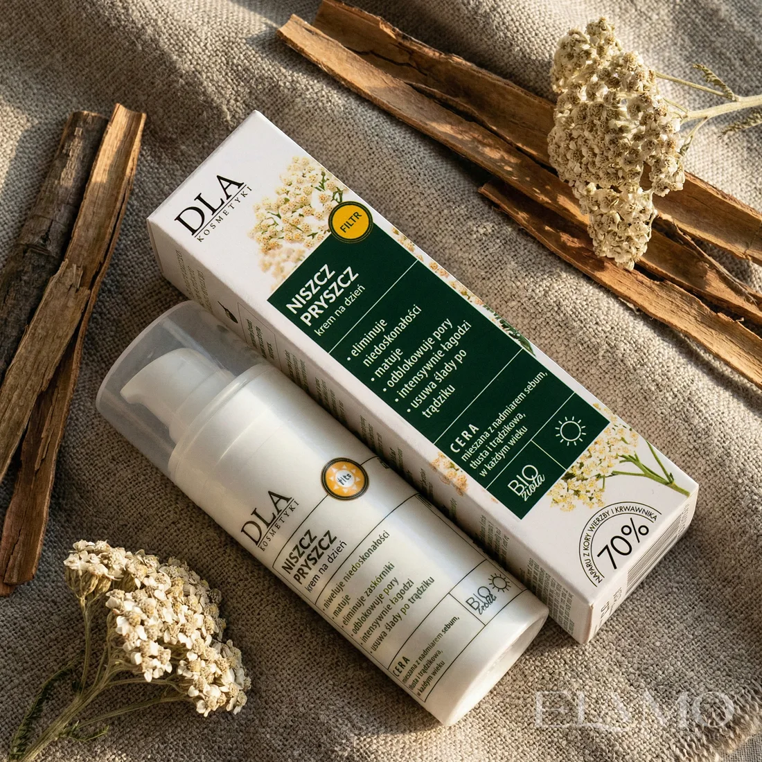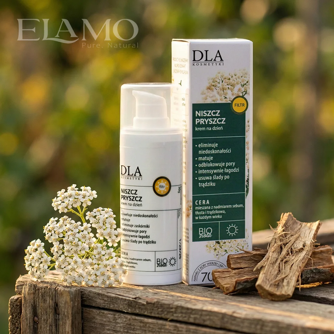 Niszcz Pryszcz krem na dzień to poranna tarcza dla cery tłustej, mieszanej i trądzikowej. Matuje na wiele godzin, a jednocześnie nawilża i łagodzi. Baza to 70% naparu z kory wierzby i krwawnika – idealny również pod makijaż.