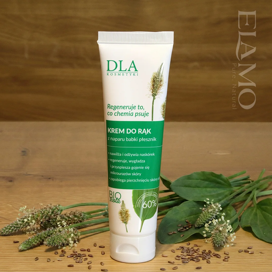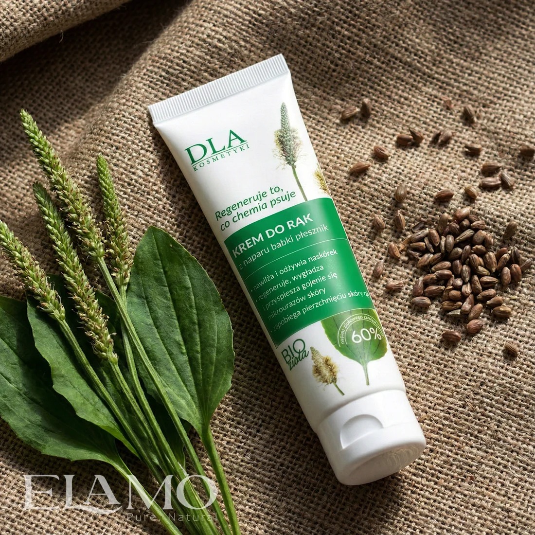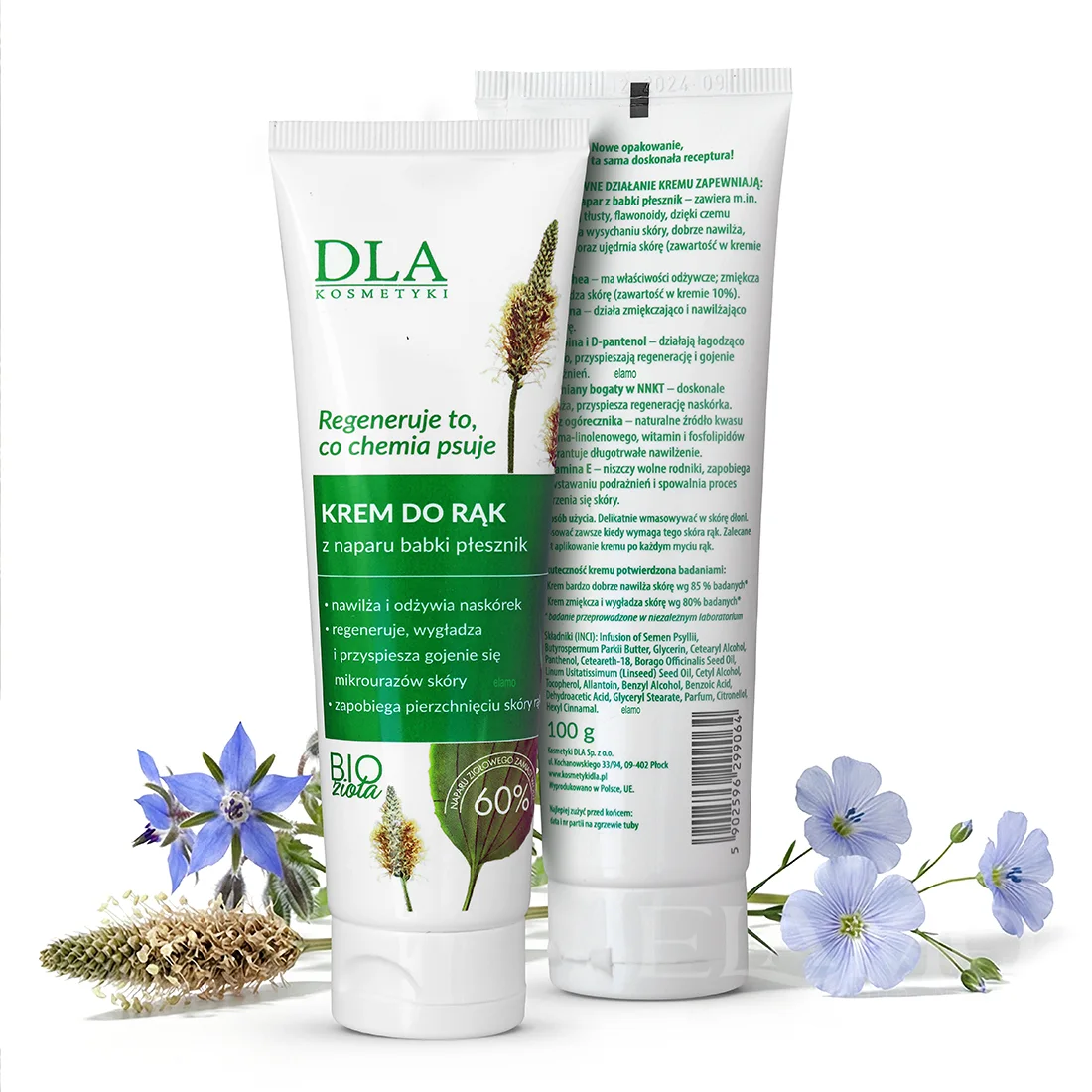 Większość kremów do rąk składa się w 70-80% ze zwykłej wody, która jest tania, ale szybko odparowuje ze skóry. Producent Kosmetyki DLA, w swojej wersji kremu do rąk zastąpił wodę świeżym naparem z nasion babki płesznika. Nasiona te pod wpływem parzenia uwalniają gęste związki śluzowe. To one tworzą na Twoich dłoniach mikroskopijną siateczkę, która:
