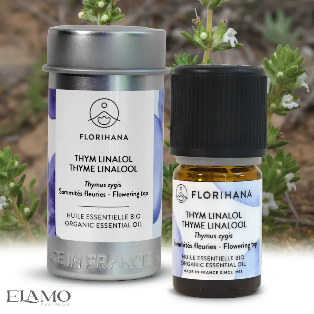 Florihana Olejek Tymiankowy Linalol BIO (Thymus zygis) z ekologicznych upraw w Hiszpanii; destylowany z kwiatostanów. Produkt jest certyfikowany BIO (ECOCERT,USDA, JAS) oraz zgodny ze standardem HEBBD. Dla każdej partii dostępne są raporty GC/MS potwierdzające czystość i skład chemiczny.
