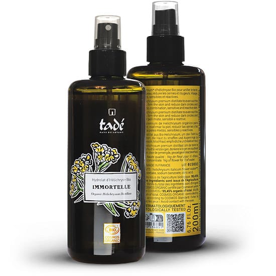 Organiczny wysoko skoncentrowany bio hydrolat z kocanki włoskiej marki Tade, powstał w wyniku destylacji olejku eterycznego z kwiatów kocanki (HELICHRYSUM) w francuskiej destylarni. Do produkcji hydrolatu użyto 1kg kwiatów kocanki na 1l wody. Ponad 99% wszystkich składników certyfikowanego hydrolatu Cosmos Organic pochodzi z upraw ekologicznych. Wyrównuje koloryt i ujędrnia skórę. Poprzez swoje działanie obkurczające ściany naczyń krwionośnych wspomaga zmniejszenie zaczerwienień i rumienia skóry. Zmniejszenia cienie i opuchlizny pod oczami. Redukuje zaczerwienienia.