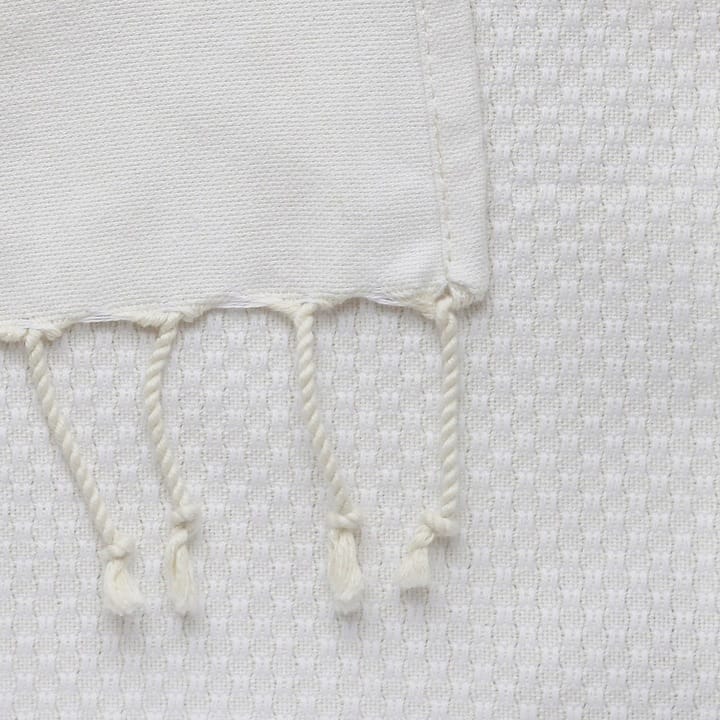 Mały ręcznik do rąk z organicznej bawełny do twarzy i/lub rąk w kolorze kości słoniowej „Ivory”. 100% organicznej bawełny, ściśle tkany gęstym splotem żakardowym, dobrze wchłania wodę, szybko schnie. Delikatny, elegancki i wygodny, z ręcznie plecionymi frędzlami, idealny w podróży.