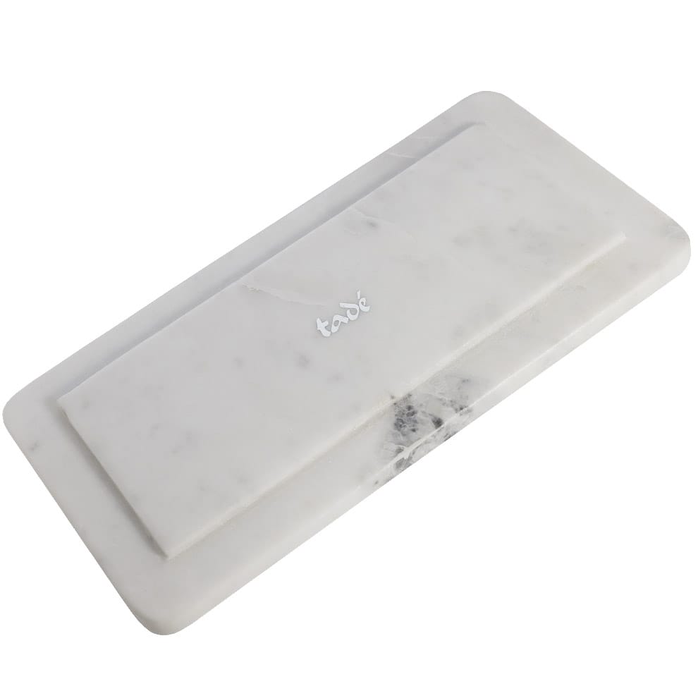 Prostokątna taca wykonana z perłowego białego marmuru, aby mydło było suche i trwałe. Mieści wygodnie cztery mydła, lub inne produkty pielęgnacyjne. Idealna dla rodzin, lub tych z nas, którzy używają kilku mydeł.