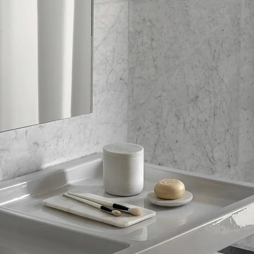 Otaczanie się naturalnymi, trwałymi i estetycznymi materiałami, takimi jak ten surowy i satynowany marmur, który jest równie stonowany, co szykowny, ma bezpośredni wpływ na samopoczucie. Czysty biały marmur pochodzi z masywu Himalajów.