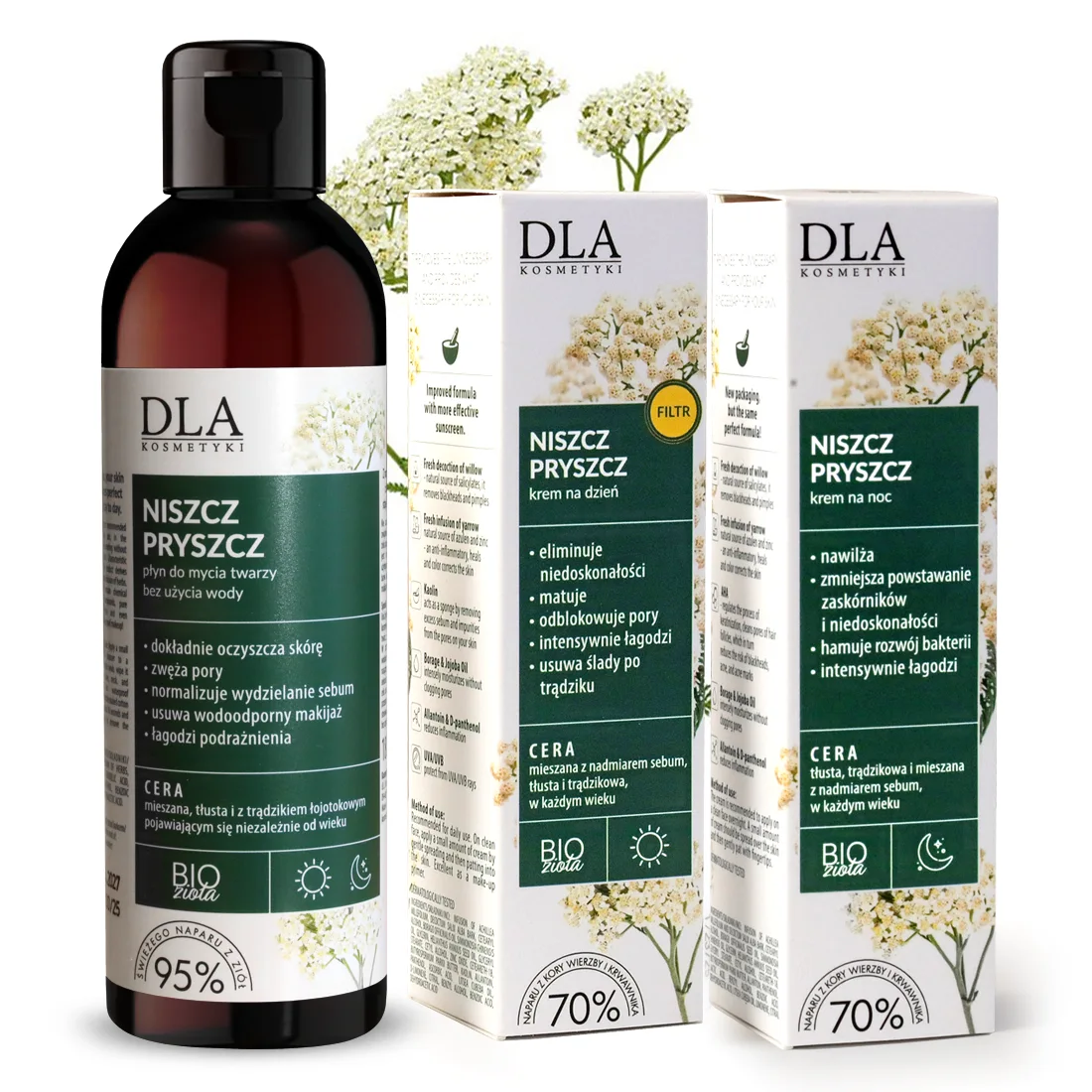 Kuracja Niszcz Pryszcz – 3 kroki pielęgnacji przeciwtrądzikowej: płyn 200 ml + krem na dzień 30 g + krem na noc 30g. Dla cery tłustej, mieszanej i skłonnej do niedoskonałości.